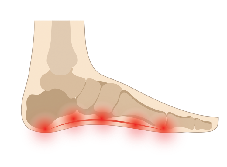 A condition in which the entire sole of the foot touches the floor when standing.Flat feet can occur during childhood if the arches of the feet don't develop, after an injury or from the wear and tear of ageing.Most people have no symptoms associated with flat feet. But some people with flat feet experience foot pain, particularly in the heel or arch area.For painful flat feet, treatments include arch supports for the shoes, stretching or a structurally supportive shoe.